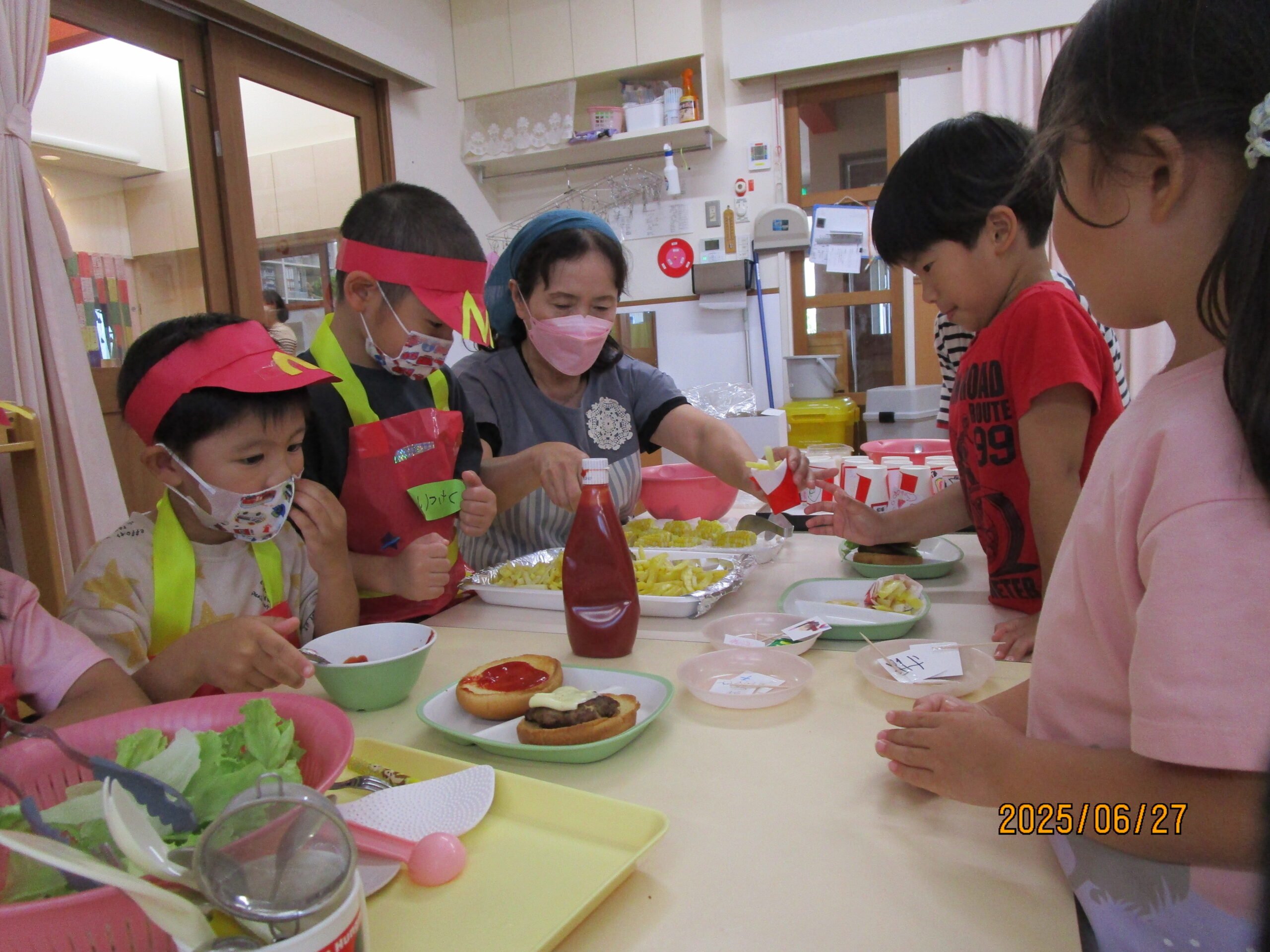 年齢ごとの個性を生かしながら、縦割りグループで協力し合い、食を通じた学びを深めています。