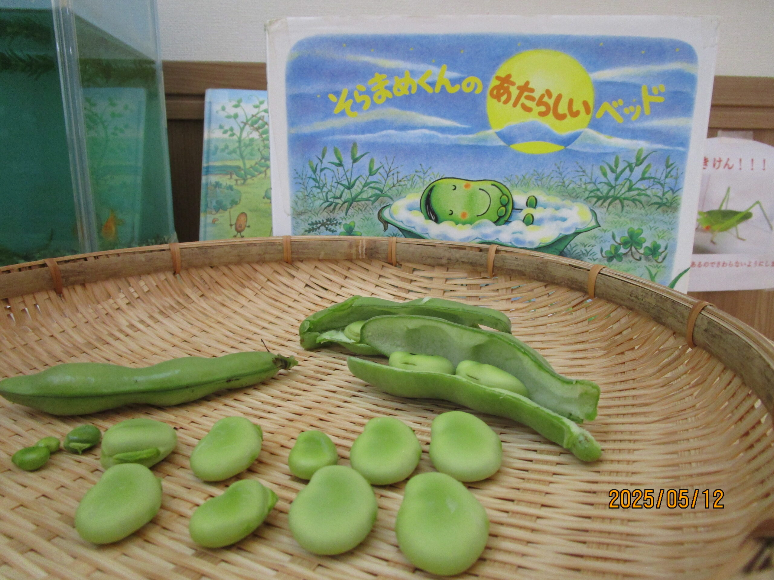 園庭の「おひさまばたけ」では、季節ごとにサツマイモ、ジャガイモ、キュウリ、枝豆、トマト、ニンジン、玉ねぎなどの作物を育てています。