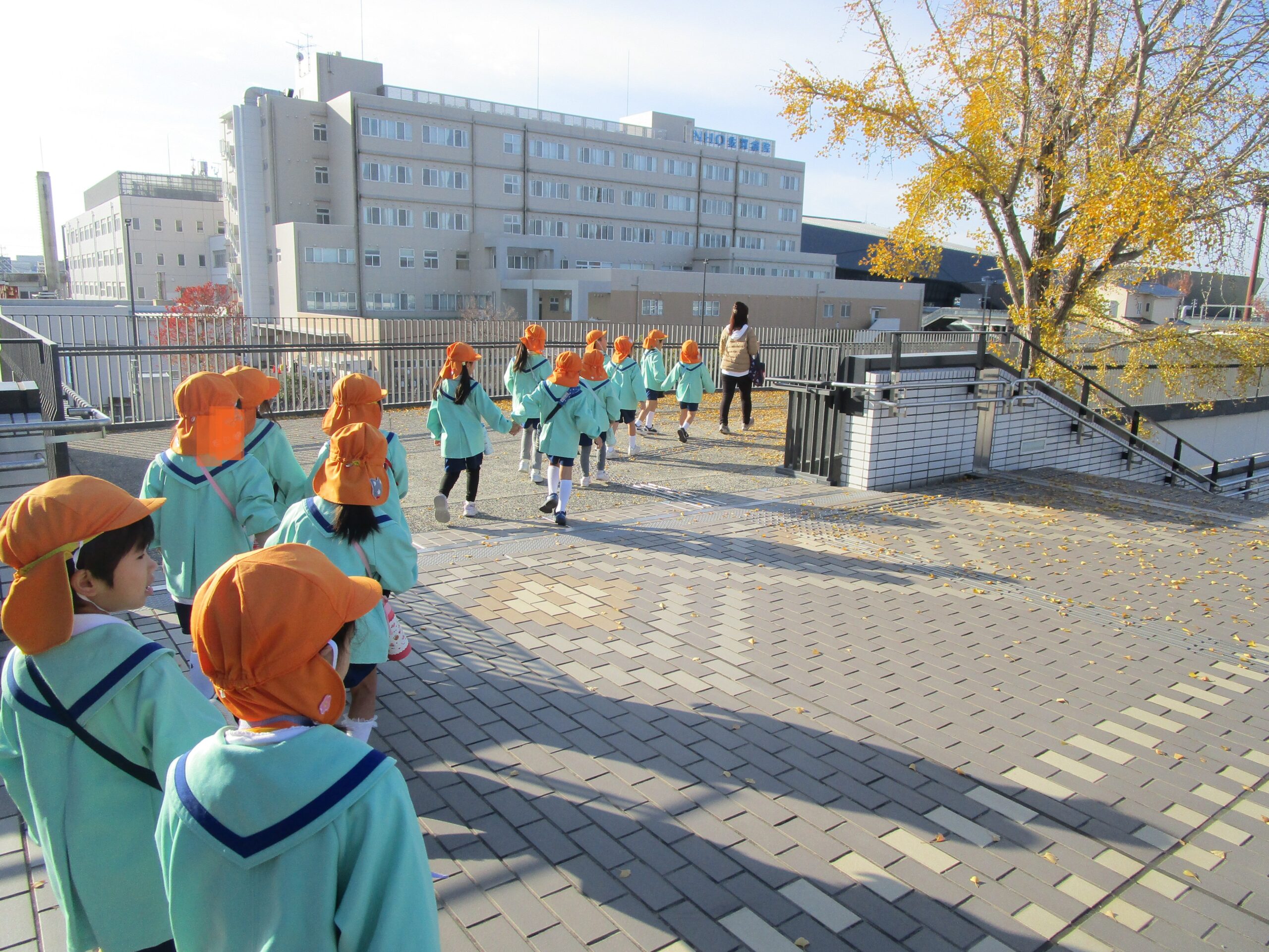 1号児は帰りは先生や友達と歩いて帰ります。園外散歩では、季節の移り変わりや風を感じながら、地域の方々との交流を大切にしています。