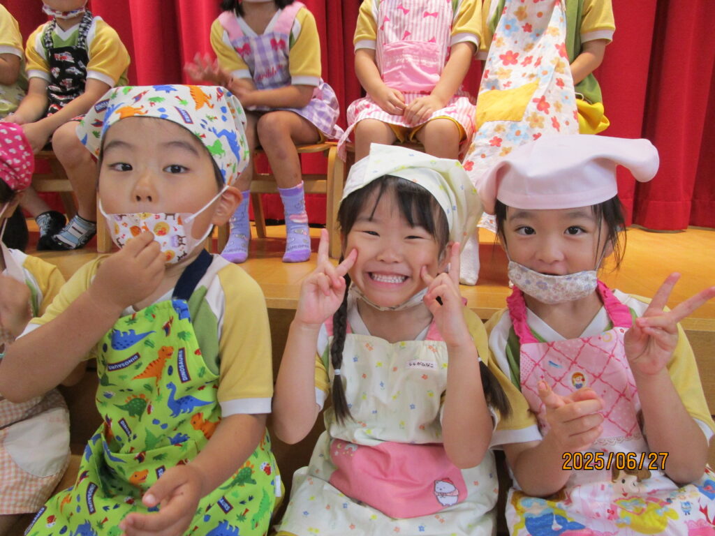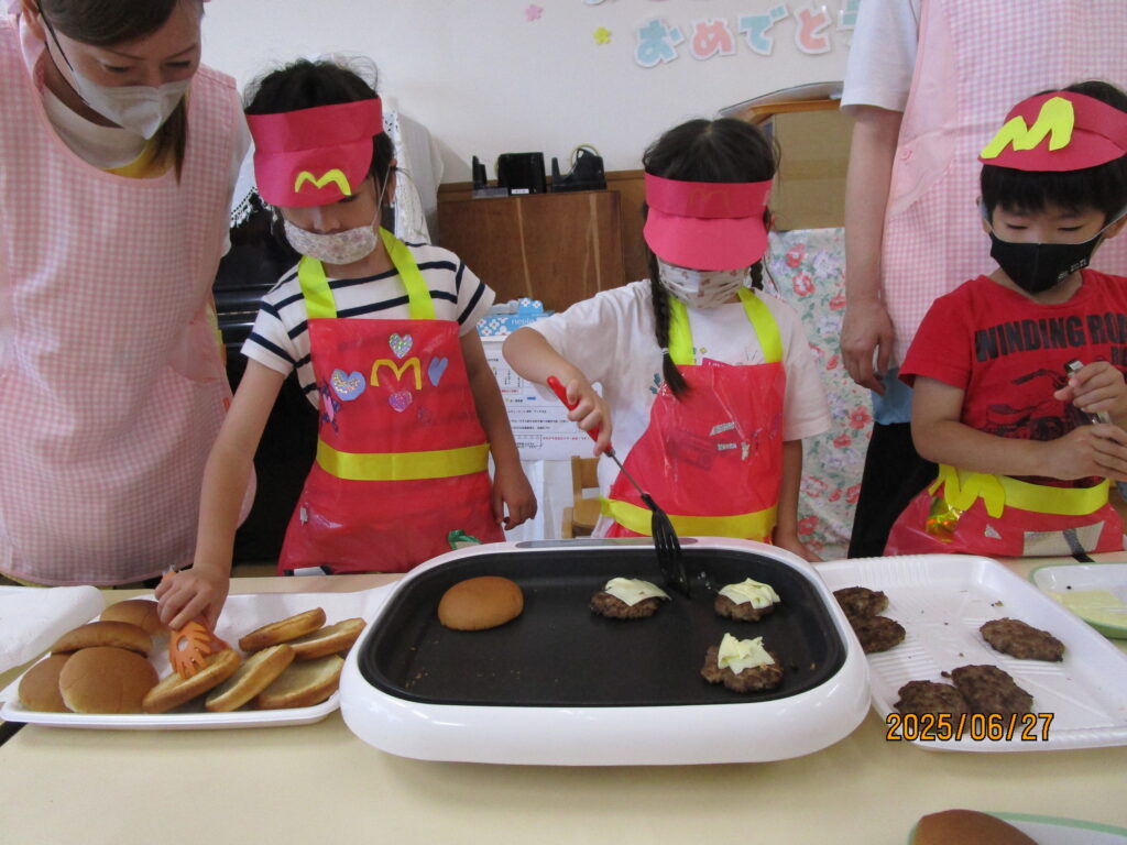 エプロンをつけてクッキング☆メニューは皆で考えたハンバーガー!!!おいしくなあれ♡