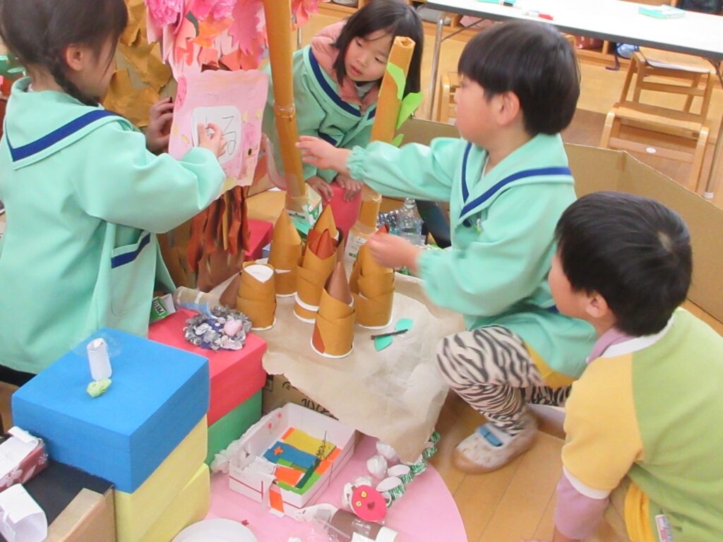 年長さんは今年度のテーマ「命~ちいさないのち~」について考え、思い思いの「ちいさないのち」を作って飾っていました。作って、遊んで、修理して・・・一年間の足跡が垣間見えます。