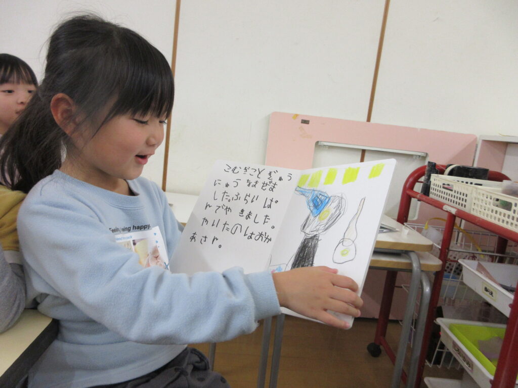 世界にひとつだけのオリジナル絵本。想像の翼を広げ、自分で作った絵本は宝物です。文字への興味をもち、お友だち同士で教え合う姿も見られました。「できた!!!」と達成感に満ち溢れた表情を見せてくれましたよ。